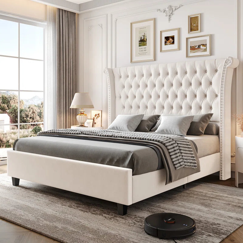 Regal Velvet Queen Bed with Winged Headboard and Button Tufting